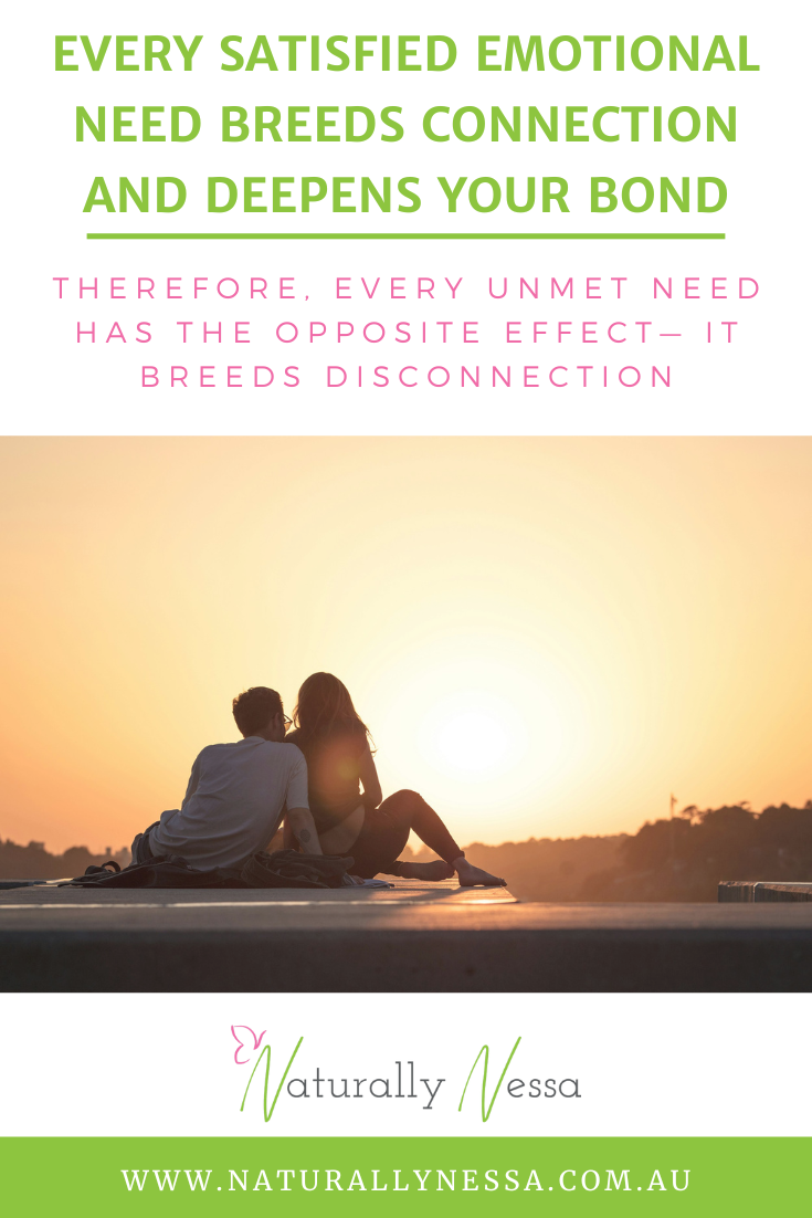 Every satisfied emotional need breeds connection and deepens your bond. Therefore, every unmet need has the opposite effect— it breeds disconnection. This happens because, when your needs aren’t consistently met, it produces distress within you, leading to conflict, which, if not handled skillfully, breeds further disconnection.